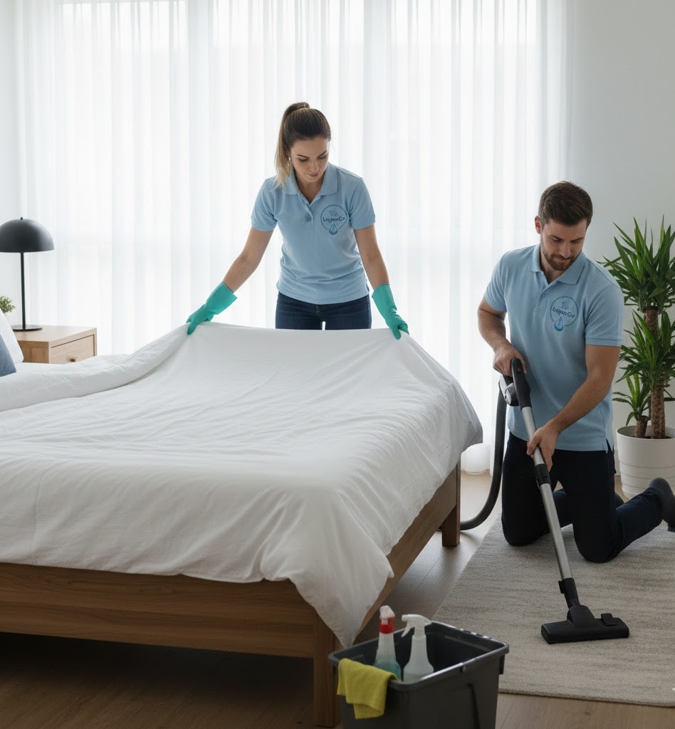• Duas pessoas limpando um quarto com cama branca e aspirador
