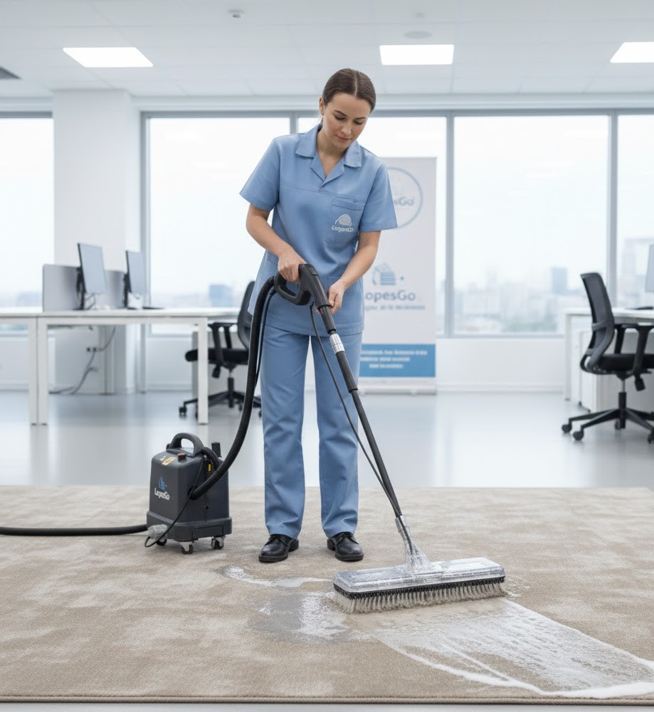 • Mulher a limpar tapete com aspirador profissional num escritório